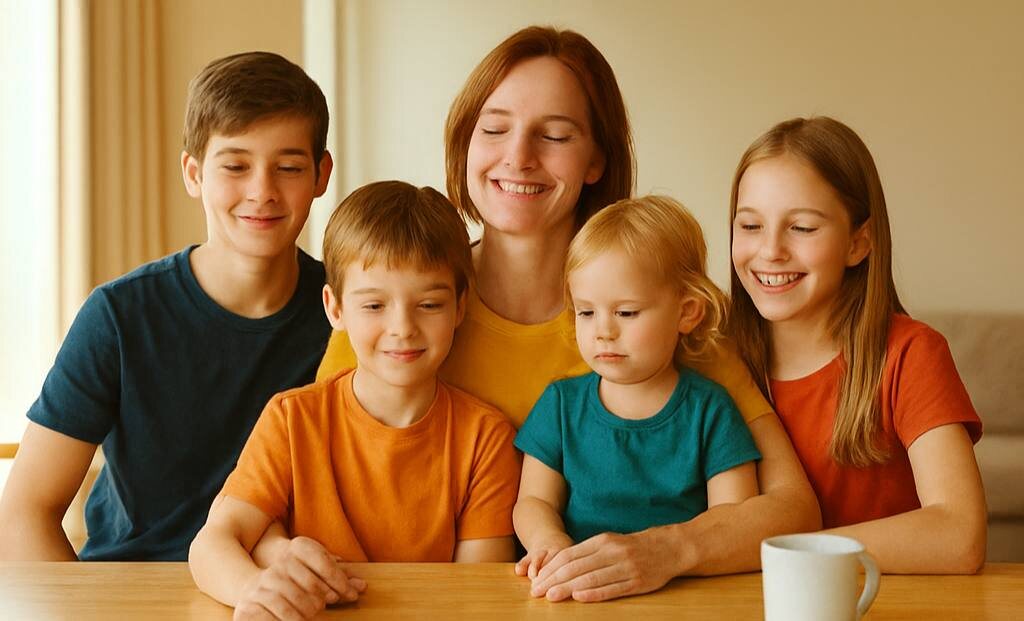 У меня четверо детей: 14, 11, 10 и 2 года. Помощников рядом нет. Всё — на мне. Было время, когда я не помнила, что ела утром, а к вечеру не могла говорить от усталости. Однажды, глядя, как младшая дочка играет в одиночестве, я подумала: «Я рядом, но я не с ней». Это стало точкой. Я не хотела просто выживать. Хотела жить. Вот что изменилось: Я больше не стараюсь всё делать «правильно». Иногда завтрак — это хлеб с сыром. Иногда уборка откладывается. Зато я не кричу и могу спокойно посидеть с ребёнком на полу. Раньше пыталась успеть всё, 25 дел, которые не дают покоя. Теперь — только три приоритета в день. Это снижает тревожность и даёт ощущение контроля. После обеда у нас “время тишины”. Старшие читают, младшая лежит в кроватке или спит, я просто лежу. Иногда закрываю глаза на 10 минут — и этого уже хватает, чтобы не сорваться. Я разрешила себе просить помощи у детей. Старшие помогают по дому, играют с младшей, накрывают на стол. Это не эксплуатация, а часть жизни в большой семье. Я отк