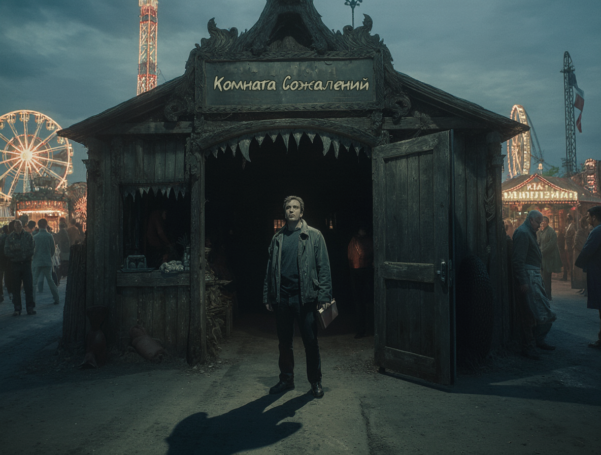 I Ярмарка приехала внезапно. Без афиш, без барабанов, без привычного запаха жареных орешков и без крикунов с кеглями и мороженым. Просто утром, вместо пустыря за гаражами, выросло нечто: палатки, огни, колёса обозрения, сахарная вата, и, самое главное, тёмная карусель из антрацита, на которой вращались вовсе не лошадки, а чёрные кабинки с закрытыми дверями. Люди ходили мимо, как заведённые, бросая туда детей и деньги. А потом заметили — один из павильонов, стоящий чуть поодаль, вовсе не похож на аттракцион. Без музыки, без света, просто квадратный тёмный вход под выцветшей вывеской: «Комната сожалений». «Психологический эксперимент», — прошептал кто-то. «Инсталляция», — хмыкнули молодые. «От бесов!» — перекрестилась бабка с семечками. Но всё равно шли. Заходили по одному. Выходили — медленно, будто постаревшие. Кто — в слезах, кто — с улыбкой. Один вышел, сел прямо на землю и закурил, глядя в небо. Женщина вынырнула — и бросила телефон в урну. Подросток вышел — и обнял мать, с которой