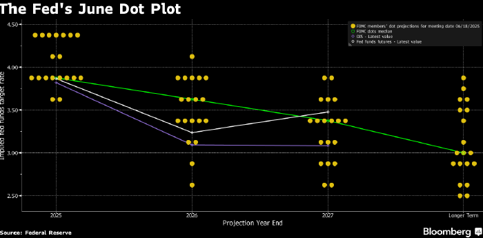 Обновленные — впервые с начала тарифной войны — медианные макроэкономические прогнозы FOMC предполагают, что к концу года инфляция в США составит 3% (против 2,7% в предыдущем, мартовском, прогнозе), а безработица — 4,5% (незначительный рост относительно мартовских оценок).
