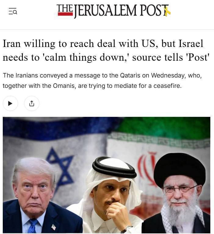 Иран готов к переговорам о прекращении огня, пишет The Jerusalem Post со ссылкой на источник. По данным издания, сегодня Тегеран передал сообщение Катару и Оману с просьбой выступить посредниками.По словам источника, условие Ирана: Израилю нужно «успокоить ситуацию».