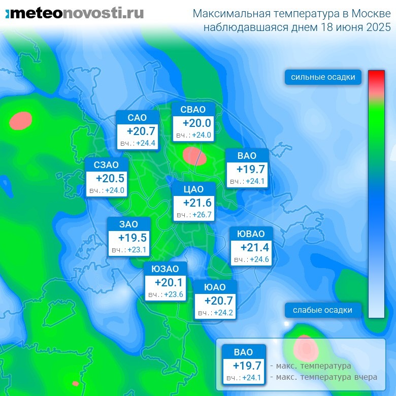 #за12часов #день Прошедший день 18 июня оказался на 4.3°C холоднее вчерашнего. Максимальная температура днём в Москве оказалась на 2.7°C ниже нормы, что в пределах обычных значений. Самая высокая температура +22.0°C была зафиксирована в 14 часов на северо-востоке города, а холоднее всего было на юго-западе: +18.2°C. Разница по максимальной температуре в разных частях столицы составила за день 3.8°C. Максимальные порывы ветра днём достигали 5 м/с. Атмосферное давление за день понизилось с 741 до 740 мм.рт.ст. Местами прошли осадки. Больше всего осадков выпало на западе города – 7.1 мм. Самый теплый день в Москве 18 июня был в 1895 году, когда максимальная температура составила +31.3°C, а холодный в 1913 году: +12.4°C. Перейти на сайт Прогноз погоды на 14 дней