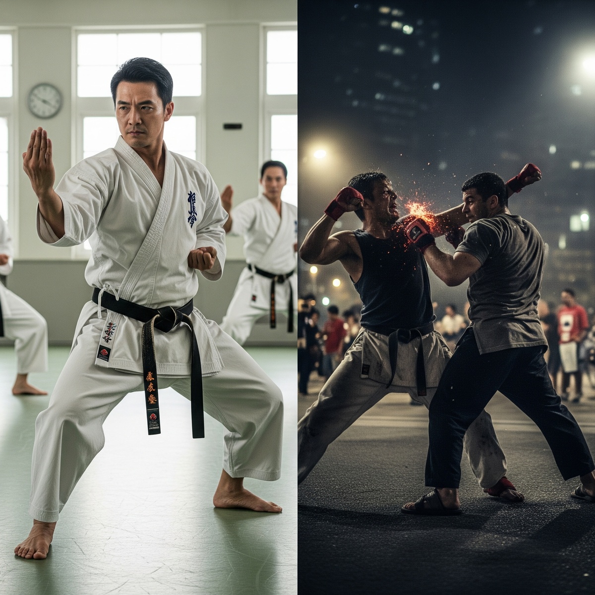 Бой — это не флаг, не пояс, не заученный крик. Это твой кулак, твоя реакция, твоя стойкость, твоя боль, твой характер, проверенный в условиях непредсказуемого хаоса. И в этом суровом, непредсказуемом мире, традиционное каратэ, к сожалению, остаётся безоружным.