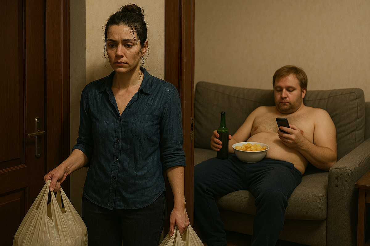 Я стояла в дверях нашей квартиры, промокшая до нитки после ливня, с тяжёлыми пакетами из супермаркета в руках, и смотрела на него. На диване в позе римского патриция возлежал мой благоверный — в трусах, с пивом и тарелкой чипсов на животе.