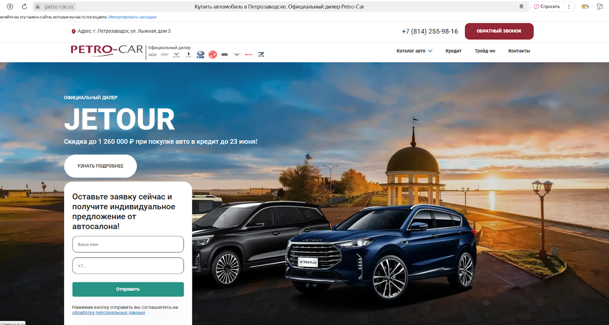 Petro Car — это автосалон в Петрозаводске. Его физическое существование ставится под сомнение. Вероятнее всего это лендинг для сбора заявок, которые обрабатываются дилером из нашего черного списка.