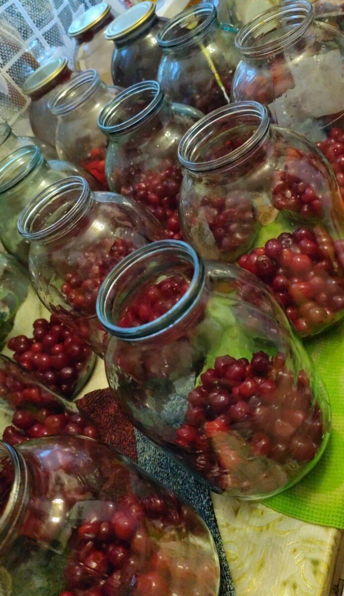 Сезон консервации официально считается открытым))). Для меня, так точно.. Компот из черевишни. Кстати, не знала о существовании такой ягоды. Оказывается это просто гибрид вишни и черешни. Слишком крупная для вишни и мелкая для черешни, но мясистая, сочная, легко отделяется от косточки и имеет обалденный аромат. Итого, 10 кг ягод = 18 3-х литровых банок компота + 4 пакета б/к на заморозку для будущих пирогов)). На 1 трёх литровую банку: 2 ст. сахара(стананы 200гр) Ягод на 1/5 часть. Заливаю дважды, на второй раз добавляю сахар. Банки не стерилизую, и отлично хранятся и не на холоде)). Это основной рецепт. Меняете ягоды на фрукты и миксуете составляющую часть на свое усмотрение. Но количество сахара и сам процесс остаётся неизменен. Я довольна результатом.