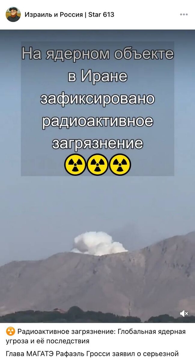 Один из произраильских пабликов ВКонтакте выложил пост, где процитировал руководителя Междунарожного агентства по атомной энергии (МАГАТЭ) Рафаэля Гросси, который заявил о серьезной радиоактивной угрозе в связи с повреждением ядерного объекта в провинции Исфахан в Иране. Далее там вполне правильно говорится о том, что данная угроза возникла и усиливается из-за урона от непрекращающихся израильских авианалетов, в том числе повреждений иранской системы ПВО. Но затем авторы делают настолько странный вывод, что сначала кажется, будто они критикуют действия израильской стороны конфликта: «Из-за отсутствия ведущих специалистов-ядерщиков Ирану не удается соблюдать необходимые нормы эксплуатации ядерных объектов. Очень жаль, что страна не готова к уступкам мировому сообществу». То есть правительство Нетаньяху развязало военную агрессию против очередного соседа по региону, создало ядерную угрозу чуть ли не мирового масштаба, ликвидировало ряд физиков-ядерщиков, способных попытаться хоть как-то
