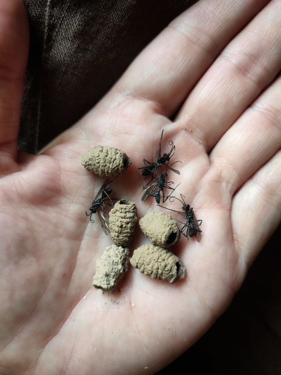 Всё сошлось — и речка очистилась, и жара жарила — стала я перестирывать горы тряпичные, которые скопились под навесом. Беру джинсы, а на них кто-то коконы слепил. В это же время шмели настойчиво в дом проникали, сквозь мышиные норы, и по инерции мне и показалось, что я шмелиную кладку разорила. Посмотрела внимательно, а коконы-то не восковые, а глиняные. Значит, не шмель, а оса, подумала так, сложила в коробочку и убрала с глаз долой.