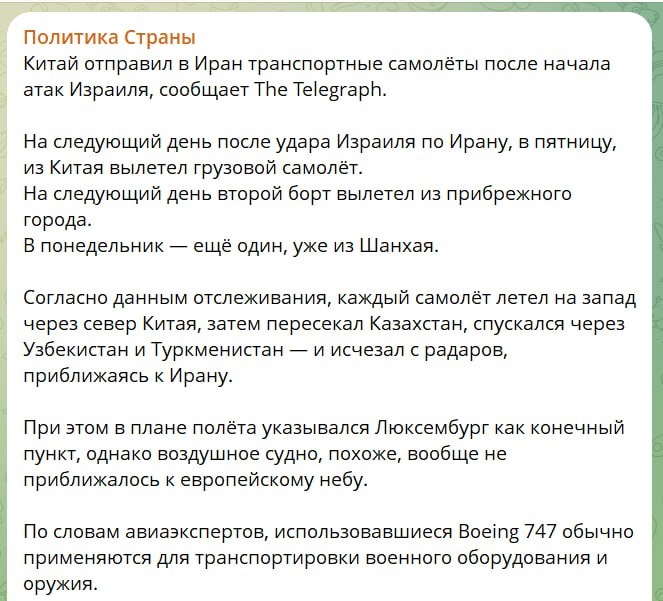 Итак, продолжается интрига — вступят или не вступят США в войну. Вчера был срок 24-48 часов. 24 часа уже прошли, ждем отсечки второго срока. В Персидском заливе сейчас находится три американские авианосные ударные группы, туда же спешит авианосная ударная группа Великобритании. И это не считая той авиации, которая сосредоточена на базах США на Ближнем Востоке, которых дофига. Все это говорит о серьезности намерений США напасть на Иран. С другой стороны, Трамп, походу дела, не очень хочет начинать эту войну. Колеблется! Посмотрим, что будет дальше. Но пока все выглядит так, будто решение о начале операции принято. Что касается непосредственно боевых действий, то о них, как бы это, сказать, ничего особо нового нет. И иранцы, и израильтяне продолжают наносить удары друг по другу. Кстати, получить собственное мнение о происходящем стало затруднительно. Тех, кто снимает прилеты вражеских ракет стали наказывать как в Иране, так и в Израиле. В Израиле вообще так обещают виновников в тюрьму са