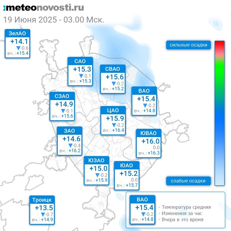 В 3:00 в Москве было от +13.1°C до +16.3°C, средняя температура +15.1°C #погода #Москва #лето #температура #19июня #четверг