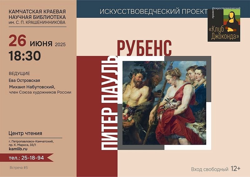 «КАМЧАТКА-ИНФОРМ». Встреча пройдет 26 июня в Центре чтения библиотеки. Начало в 18:30. Вход свободный. Возрастное ограничение 12+. «Ведущая Ева Островская расскажет о жизни и творчестве выдающегося художника Питера Пауля Рубенса (1577-1640) – выдающегося нидерландского (фламандского) живописца, одного