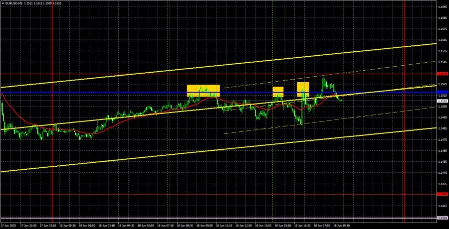 https://basechop.ru/wordpress/?p=46956 Анализ EUR/USD 5M. Валютная пара EUR/USD в течение четверга, как и предполагалось, начала восстановление после падения во вторник. Напомним, что в сегодняшних статьях мы не рассматриваем результаты заседания ФРС и реакцию рынка на это событие. Мы считаем, что для того, чтобы делать выводы об этом событии, нужно дождаться хотя бы середины четверга. Тогда трейдеры из Евросоюза и Америки в полной мере смогут оценить результаты заседания, принятые решения, сделанные прогнозы. Как мы уже говорили, очень часто случаются ситуации, когда цена после столь важного события летит в одну сторону, а в течение следующих 10-20 часов возвращается на исходные позиции. В среду важных публикаций не было ни в США, ни в ЕС. В Евросоюзе вышла вторая оценка инфляции за май, но она ничем не отличалась от первой, более важной оценки. Индекс потребительских цен в Европе замедлился уже до 1,9% г/г, что позволяет ЕЦБ и дальше продолжать смягчение монетарной политики. Правда