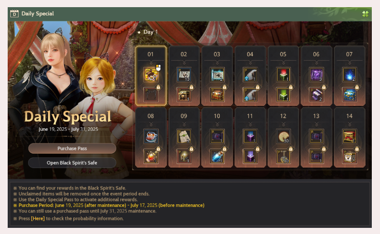 2. С 19 июня по 31 июля станет доступен специальный календарь наград. Как обычно верхняя часть наград доступна для всех, нижняя часть наград доступна если купить специальную подписку за жемчуг. Из нового это украшение Черная кошка, скрины в новости.