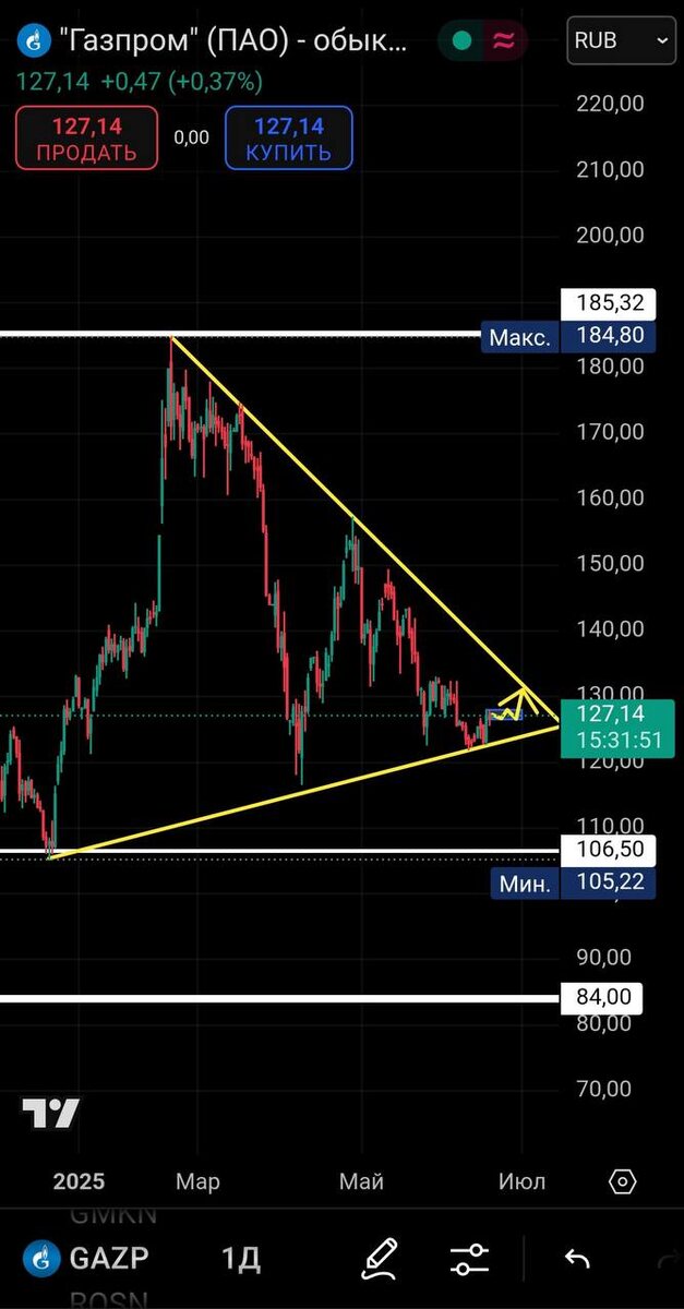⛽️$GAZP и ⛽️$ROSN Взрывной выход из треугольника уже в июле? Где искать точки входа и сколько можно заработать на движении! Пара нефтяных идей, Конечно интересно слышать что какой то, Американский бизнесмен имеет виды на выкуп северных потоков, Но этот пост про теханализ. Газпромовскому треугольнику, Уже седьмой месяц пошёл, И в июле будет выход, пристегните ремни, Движ будет нормальный. А пока по 123 покупаем по 132 продаем. Роснефть тут уже хорошие объемы, И чёткие уровни на месячном таймфрейме, Снизу 425,4 а сверху 607,8 Это уровни для набора долгосрочных позиций. А если вы как и я последние три месяца, Покупали Роснефть, ближе к 410 и продавали в районе 450 то вы красавчики, Имейте ввиду скоро боковик закроется, И будет выход, либо пойдём в сторону 607 либо на 291 (уровень от 2008) Следите за максимальным значением мая, 463 если пробъем вверх полетим быстро вверх.