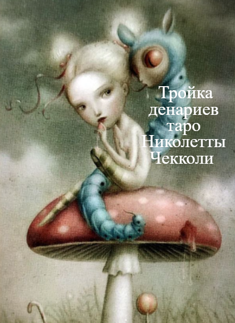 Остерегайтесь сомнительных советов и не поддавайтесь соблазнам. Тройка Денариев в данной колоде совсем не похожа на классическую и говорит о соблазнах или сомнительных советах от посторонних людей, обмане и дурной компании. Кто-то пытается подстрекать к сомнительным шагам, которые могут принести большие проблемы. Всё происходит в момент, когда человек ищет помощи со стороны и оказывается в ситуации, в которой вместо дельного совета получает сомнительные предложения. Однако значение аркана сильно зависит от окружения и в некоторых случаях может просто указывать на то, что не стоит браться в одиночку за сложные дела, окружающие помогут вам в этом выбрать правильное направлении. На этой карте мы видим сюжет из «Алисы в Стране Чудес».