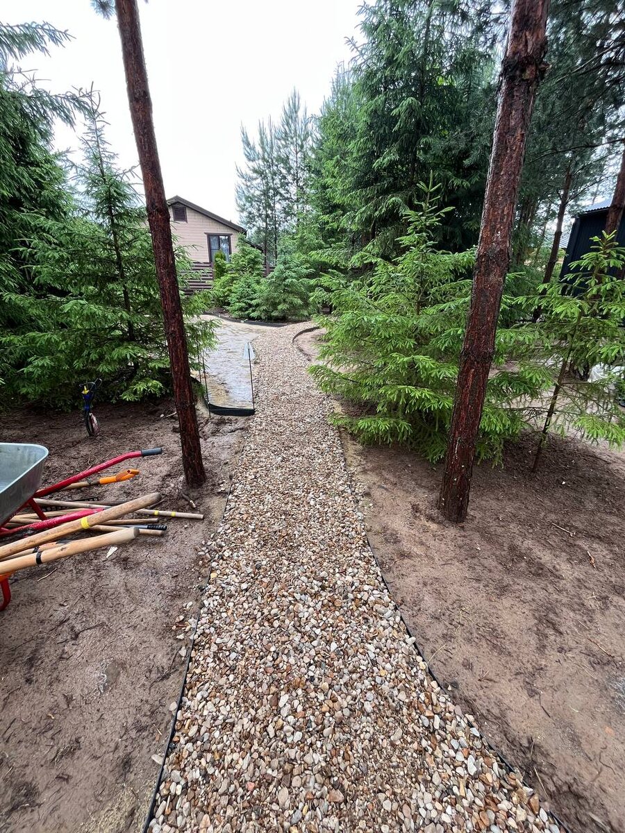 Несмотря на капризы погоды, мы всё-таки умудрились распределить щебёнку, отсыпать дорожки и доделать крепление пластикового бордюра. Дожди реально усложняют жизнь: земля превращается в кашу, куда ни ступишь — вязнешь.