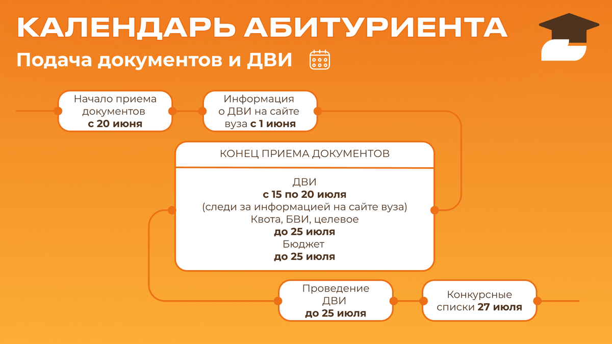 Результаты экзаменов получены, впереди - выбор вуза и подача документов. Как сделать правильный выбор и в какие даты? Рассказываем, как справиться с поступлением в 7 шагов. 🔸 Шаг один - считаем баллы: Подсчитай свой суммарный балл за все экзамены, подумай, сколько ты можешь получить за индивидуальные достижения (помни, в разных вузах дают разное количество баллов) и на какой балл ты ориентируешься на ДВИ. Знание суммарного балла позволит тебе понять, в какой вуз ты можешь пройти, а в какой - нет. 🔸 Шаг два - выбираем вуз: Составь список вузов, в которые ты можешь подать документы, отталкиваясь от твоего набора предметов на ЕГЭ и среднего проходного балла прошлых лет. Средний проходной балл - это средний балл среди всех поступивших на данное направление. Его можно найти на сайте вуза или сервисах по поступлению. Посмотри, относишься ли ты к одной из категорий детей, имеющих право на льготы при поступлении, как правило, проходной балл для них ниже. Если подходишь - подготовь документы