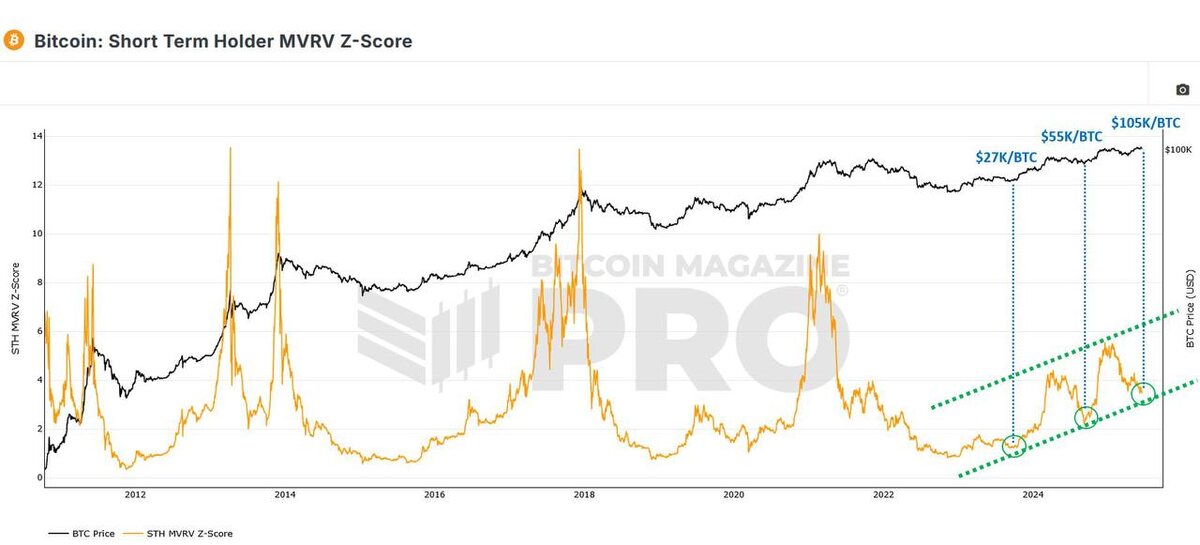 STH MVRV снова у линии поддержки. Что это значит для биткойна? Есть индикаторы, которые не нуждаются в «новостном фоне». Они просто работают. На графике — Z-оценка MVRV для краткосрочных держателей (STH MVRV Z-Score). Проще говоря, он показывает, насколько прибыльны или убыточны сейчас те, кто недавно купил биткойн. Исторически этот индикатор отрабатывал как точка разворота с ювелирной точностью: — В марте 2023 на $27,000 — отскок — В сентябре 2023 на $55,000 — отскок — Сейчас — $105,000 и снова подход к линии поддержки Что это значит? Если мы сохраняем ту же структуру, следующий импульс может начаться прямо отсюда. Психологическая «перегретость» убывает, при этом цена остаётся выше всех предыдущих пиков. Это бычий паттерн. Что делать? Следите за реакцией от зоны $102–105K. Если MVRV отскочит — это может стать стартом новой волны роста. Если пробьём — вероятна глубокая коррекция. Но пока — всё говорит за продолжение бычьего цикла. Хотите сделаю отдельный пост: как работает MVRV