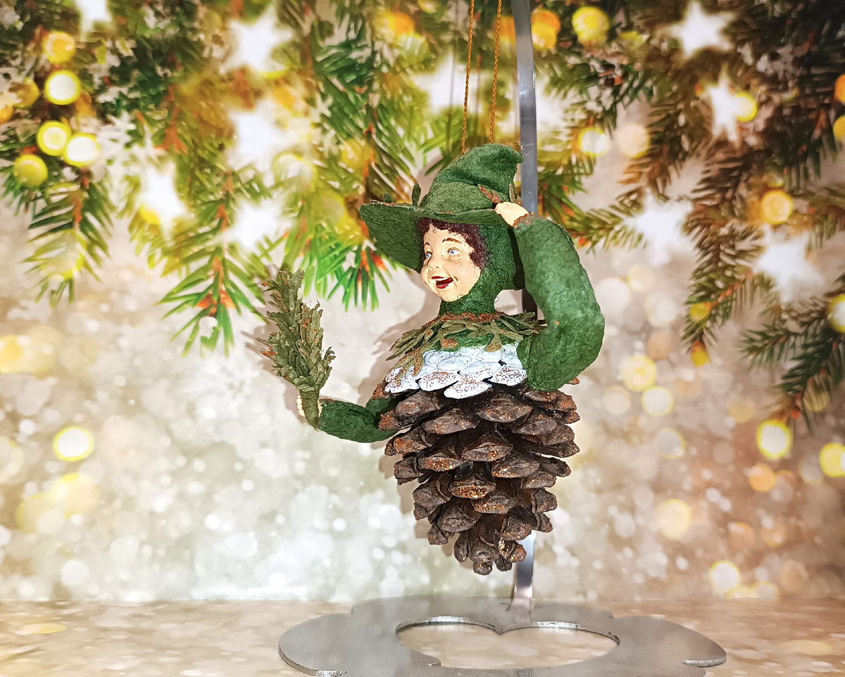 Надо признаться, работа над ним не вызывает сложностей, кроме, возможно, укрепления ручек среди чешуек шишки - они хрупкие, и обращаться с деталями нужно очень осторожно, чтобы не разрушить шишку. Но это следует учесть именно в моменте крепления и придания рукам позы - просто проведите манипуляции заранее, согните проволоку и вклейте ручки уже в той позиции, которая предполагается в завершенном образе мальчика. Дальше можно наращивать слои ваты без опаски, чешуйки задевать мы не будем.