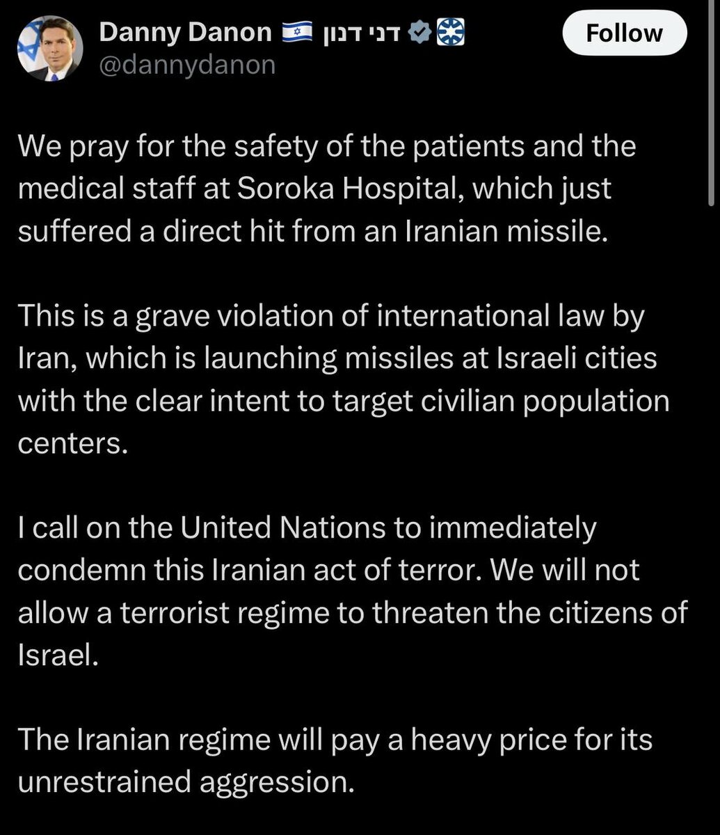 В ответ на пост We pray for the safety of the patients and the medical staff at Soroka Hospital, which just suffered a DIRECT HIT from an Iranian missile — Israel's Ambassador to the UN Danny Danon Danon insists it was a direct hit, even though Iranian media say it’s shockwaves that caused damage