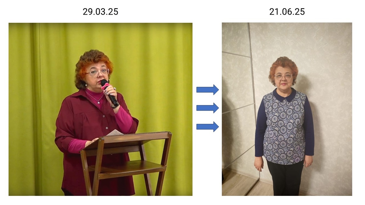 Дорогие друзья! Хочу поделиться с вами промежуточными результатами совместной работы с моей тётей. Моей тёте Л. 63 года, рост 170 см, вес до начала работы - 100 кг, а спустя всего 2,5 месяца – 91,95 кг, то есть минус 8 кг. При этому ушли проблемы со здоровьем – нормализовалось давление (было под 240), и улучшились показатели крови – холестерин и глюкоза снизились. Прикладываю фото до и после. К сожалению, фото "до" специально не делали, нашла только такое. На мой взгляд, разница есть, Л. – большая молодец! Сражу скажу, с родственниками работать оказалось сложнее, чем я думала. Так как без стеснения на меня сыпались различные возражения, сомнения и скепсис. По крайней мере, в начале. Потихонечку вместе с улучшением самочувствия скепсис уступил место интересу. А после обращения к гастроэнтерологу, рекомендации которого только подтвердили мои советы "неврача", - доверию. Да и лабораторные анализы "до" и после" соответствуют улучшившейся клинической картине. При этом в период с июля по дек