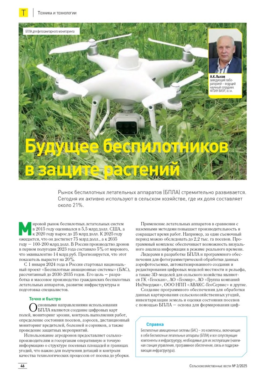 Агродроны в защите растений Рынок БПЛА стремительно развивается. Сегодня они активно используются в сельском хозяйстве, где их доля составляет около 21%. С 1 января 2024 года в России стартовал национальный проект «Беспилотные авиационные системы» (БАС), рассчитанный до 2030-2035 годов. Об особенностях использования агродронов при защите растений рассказывает Анатолий Константинович Лысов, заведующий лабораторией – ведущий научный сотрудник ФГБНУ ВИЗР, к.т.н. https://agri-news.ru/zhurnal/2025/2-2025/budushchee-bespilotnikov-v-zashchite-rasteniy/ #АПК #АПКЛО #ВИЗР #агродроны #защитарастений