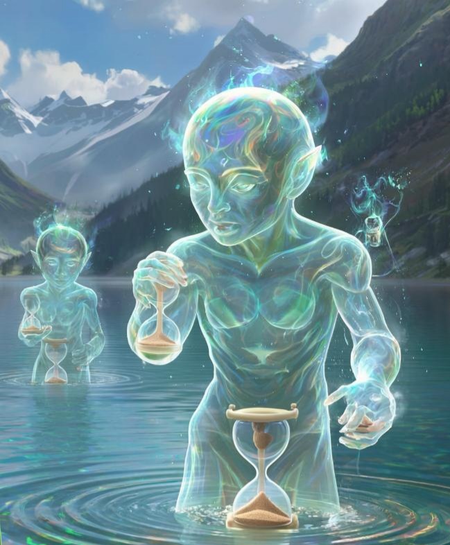 Плазмоиды времени живут в гармонии с природой и обладают уникальными способностями, из потерянных энергий они создают различных питомцев, которые потом чудесным образом возникают у человека на его жизненном пути, становясь новыми событиями. Особенно им нравится ваять котиков и собачек. А вы думали, что ваши любимцы появились у вас случайно? Хм... Люди часто тратят драгоценные минуты впустую, погружаясь в заботы и суету. Именно эти секунды-потери собирали хранители, они двигались в озере ритмично и грациозно, складывая невидимые нити временнóго потока воедино. Создавалось впечатление, что каждое существо владеет особым искусством танца, соединяя прошлое, настоящее и будущее в единый гармоничный узор. Иногда кто-то из них приближался ближе к поверхности воды, чтобы приветливо взглянуть на девушку взглядом ясных синих глаз.