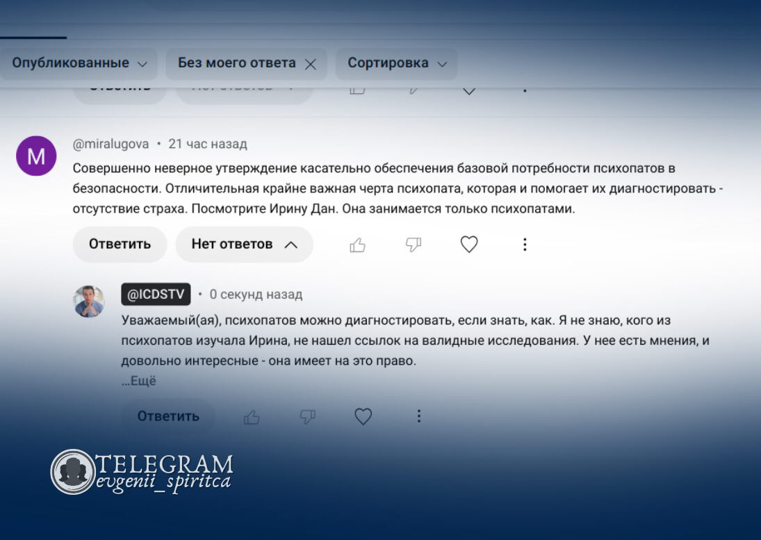 "Уважаемый(ая), психопатов можно диагностировать, если знать, как. Я не знаю, кого из психопатов изучала Ирина, не нашел ссылок на валидные исследования. У нее есть мнения, и довольно интересные - она имеет на это право.