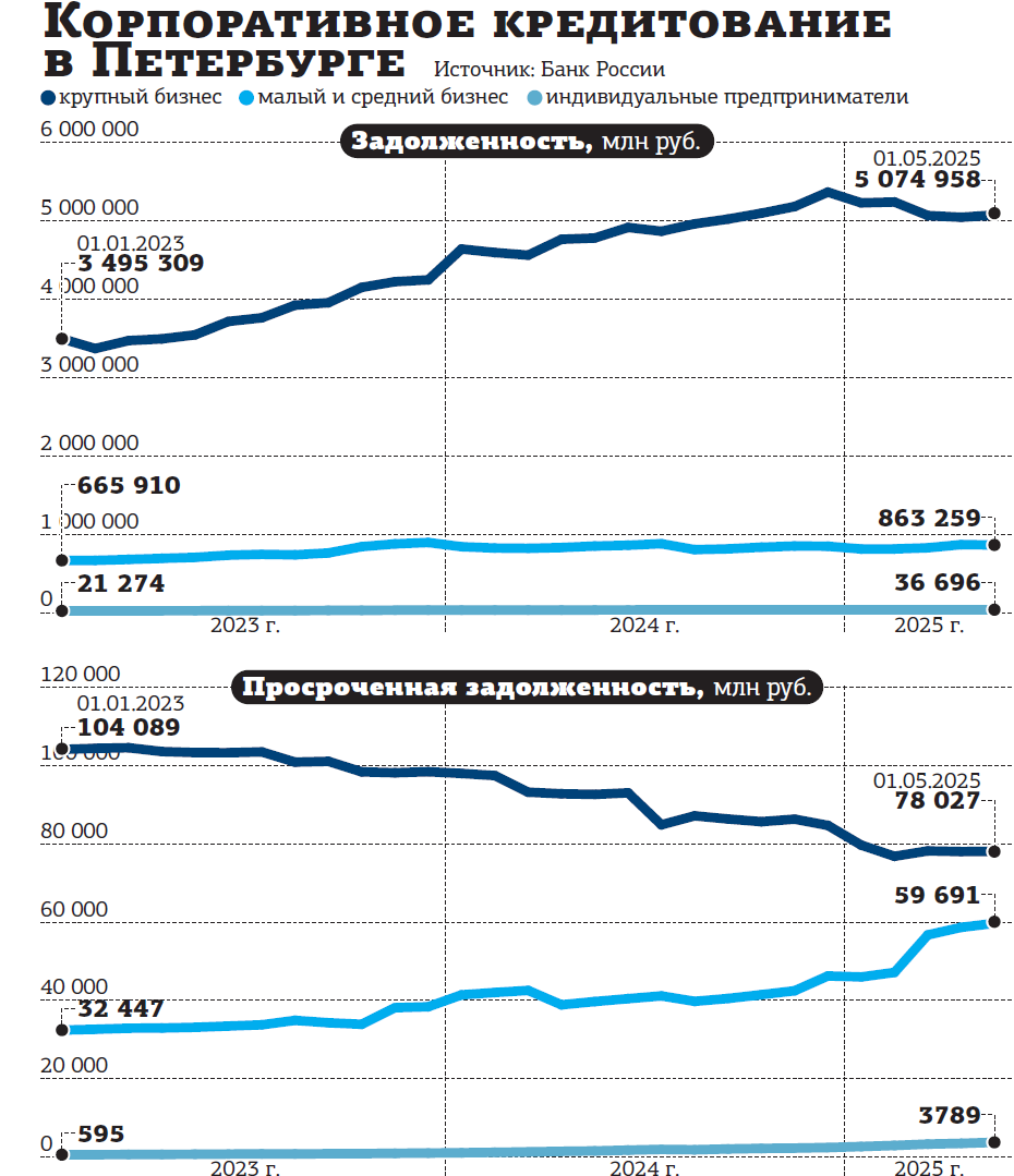 По данным ЦБ РФ, корпоративный портфель по итогам 2024–го в Петербурге достиг 6,08 трлн рублей, показав прирост на 10% по сравнению с началом 2023–го. С начала 2025–го он сократился на 2%. По последним доступным данным ЦБ РФ на начало мая, задолженность бизнеса города перед банками составила 5,97 трлн рублей. Снижение может быть связано как с сезонным фактором, так и с досрочными погашениями крупных заёмщиков. Или невозможностью бизнеса привлекать кредиты из–за ужесточения политики банков.