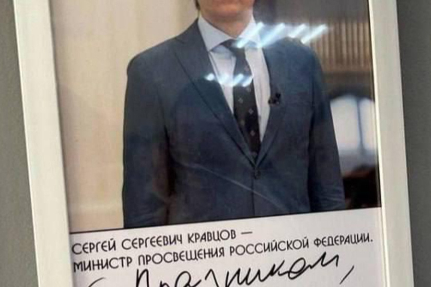 Министр просвещения Сергей Кравцов поздравил лагерь Артек, расписавшись на своем портрете. Однако в текст вкралась досадная ошибка: буква "Д" потерялась.