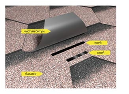 - С использованием битумного клея. На лицевой стороне каждого гонта имеются клеевые полосы, на которые накладываются лепестки верхнего элемента во время монтажа. При солнечном нагреве битумные слои на клеевых полосах и обратной стороне лепестков плавятся, создавая прочное соединение на межмолекулярном уровне. Этот процесс соединения гибкой черепицы, аналогичный сварке металла, называется сваркой гонтов.