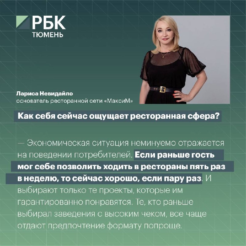 Основательница ресторанной сети «МаксиМ» в интервью РБК Тюмень рассказала о том, почему Тюмень интересна федеральным игрокам, удастся ли удержаться небольшим заведениям и как будет развиваться ресторанный рынок в ближайшее время. Полная версия разговора — на сайте.