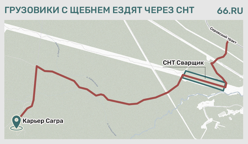 Владельцы участков в СНТ «Сварщик» (недалеко от Среднеуральска и озера Балтым) написали обращение к врио губернатора Свердловской области Денису Паслеру (есть в распоряжении редакции). По дороге вдоль их садов каждый день ездят десятки самосвалов. У каждого из них в кузове — тонны щебня, который добывают на карьере «Сагра». Владельцы домов требуют: Кроме этого, грузовики неоднократно создавали аварийные ситуации. О том, что происходит в СНТ, можно судить по видео ниже: Собственники дач подчеркивают, что неоднократно обращались в Роспотребнадзор, ГИБДД, мэрию Верхней Пышмы. «Члены СНТ доведены до отчаяния. Мы неоднократно перекрывали дорогу и готовы перекрыть федеральную трассу», — говорится в письме. Карьером «Сагра» пользуются две компании — «Селен-Щебень» и «ПРО Щебень». В июне региональное министерство транспорта потребовало от них реконструировать примыкание к трассе и построить полосу разгона. Документ, подтверждающий это требование, есть в распоряжении редакции 66.RU. Обязанность