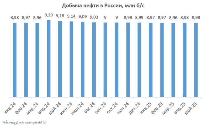🛢 ОПЕК+ в последнее время чуть ли не каждый месяц объявляет о планах по увеличению добычи нефти, что заставляет нервничать инвесторов, из-за опасений снижения нефтяных цен на этом фоне. Предлагаю вместе с вами попытаться разобраться, насколько реальная добыча отличается от заявленных целей, опираясь на свежие данные майского отчета ОПЕК. Итак, как вы можете помнить, в начале апреля состоялась встреча членов альянса ОПЕК+, на которой было принято решение повысить добычу сырой нефти на 411 тыс. б/с в мае. Однако в реальности прирост составил лишь половину от заявленного - 202 тыс. б/с. Из которых на Россию пришлось всего +3 тыс. б/с, в результате чего наша страна незначительно нарастила объём добычи до 8,98 млн б/с. - данный уровень оказался на 2% ниже, чем за аналогичный период предыдущего года: В июне запланировано ещё одно повышение добычи нефти, снова на 411 тыс. б/с, однако, скорее всего, фактические результаты снова не совпадут с планами. Страны-инициаторы роста нефтедобычи, такие