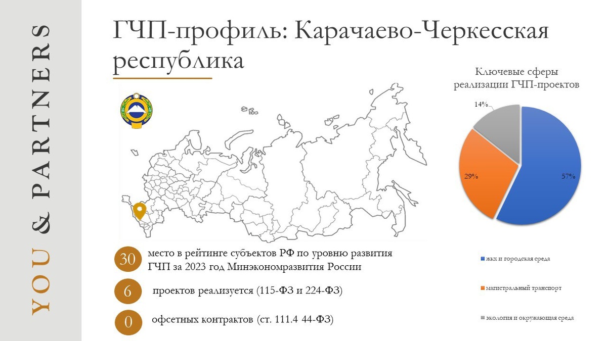 🏆 Место в рейтинге Согласно итоговой оценке рейтинга субъектов РФ по уровню развития ГЧП за 2024 год (Минэкономразвития России), Карачаево-Черкесская республика занимает 30 место (поднявшись на 30 позиций по сравнению с 2023 годом). Наиболее интересный проект, планируемый к реализации на территории Карачаево-Черкесской республики: ⚙️ Модернизация прядильного производства путем создания цеха покраски пряжи и расширение номенклатуры производимой продукции. 🧮 Количество проектов По данным РОСИНФРА в регионе реализуется 6 ГЧП-проектов (учтены проекты по 115-ФЗ и 224-ФЗ на стадиях от предынвестиционного этапа до завершения проекта). 🧩 Сферы реализации проектов: Проекты реализуются в следующих сферах: - жкх и городская среда (4 проекта); - магистральный транспорт (1 проект); - экология и окружающая среда (1 проект). Примеры проектов (по данным РОСИНФРА): 🛫 Концессионное соглашение на проектирование, строительство и эксплуатацию нового аэропортового комплекса «Архыз» (КС заключено 15.07.2