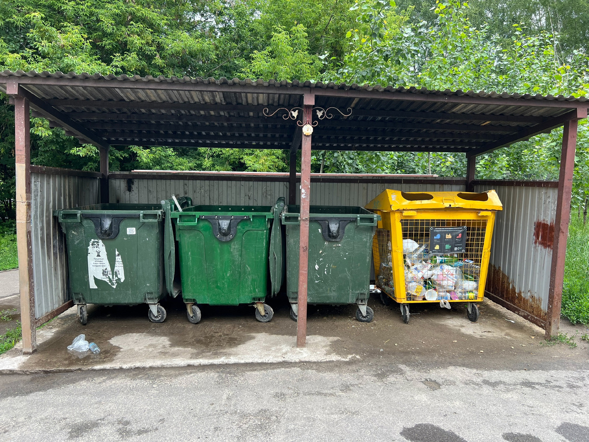 Но! Хоть это и двухпоточный раздельный сбор, контейнер для вторсырья легко отличим, хорошо выделяется из общей грязи контейнеров для мусора, стоит обособлено и имеет крышки. И это сразу выделяет бак среди слепых контейнеров для мусора в темном домике площадки.
