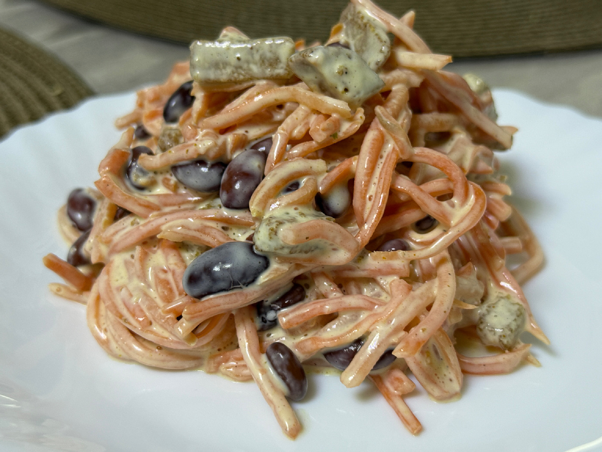 Добро пожаловать на мою кулинарную страничку! Я очень люблю быстрые рецепты и сегодня хочу поделиться с вами вкусным салатом, который очень экономит время! Салат из фасоли с морковью по-корейски вы реально приготовите всего за 1 минуту. Он получается очень сытным. Подавать его можно как самостоятельное блюдо или как дополнение к мясу. Салат этот делаю часто, когда-то его рецепт я нашла на просторах интернета и с тех пор, он у меня один из любимых. Ингредиенты: ********************************************************************************** Приготовление блюда: 1. В салатник выложить морковь по-корейски. 2. Добавить консервированную фасоль, с которой предварительно необходимо слить всю жидкость. 3. Добавить сухарики. Я выбираю со вкусом бекона. 4. Заправить салат майонезом и все перемешать. Приятного аппетита!