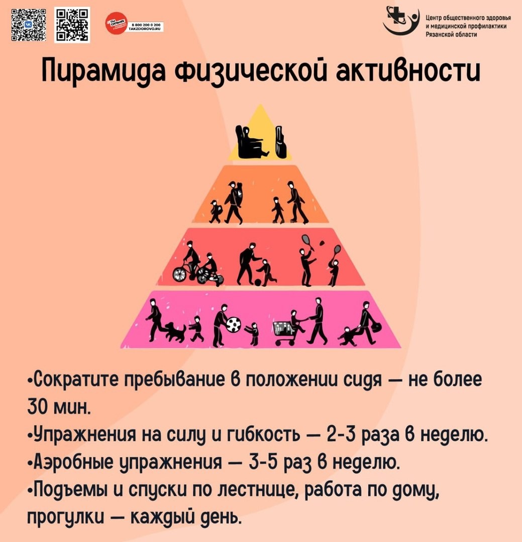 🚴♂️ Продолжается неделя продвижения активного образа жизни! ❓Что такое пирамида физической активности? 🗨Пирамида физической активности – это модель, которая помогает структурировать физическую активность для достижения оптимального уровня здоровья. Она состоит из нескольких уровней: 1️⃣Основание пирамиды: Это ежедневная физическая активность, такая как ходьба, работа по дому, езда на велосипеде и другие виды деятельности, которые помогают поддерживать базовый уровень физической формы. 2️⃣Средний уровень: Здесь находятся умеренные физические нагрузки, такие как бег трусцой, плавание, танцы и т.д. Эти занятия способствуют укреплению сердечно-сосудистой системы и улучшению общего самочувствия. 3️⃣Верхушка пирамиды: На этом уровне располагаются интенсивные тренировки, например, силовые упражнения, высокоинтенсивный интервальный тренинг (HIIT) и другие виды спорта, требующие высокой выносливости и силы. #Здоровоебудущее #Здоровоебудущее62 #ЗдороваяРязань
