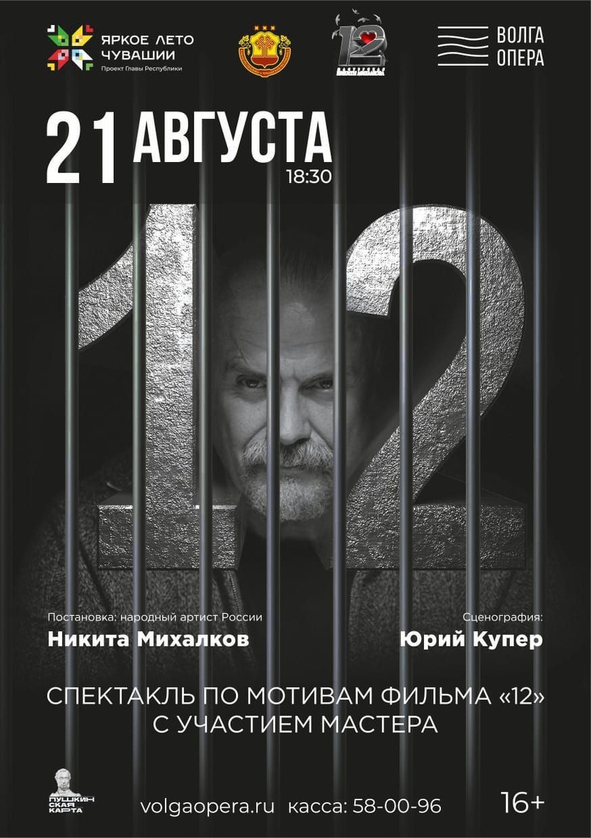 21 августа в Чебоксарах вновь выступит Народный артист России Никита Сергеевич Михалков вместе с «Мастерской «12»: на сцене «Волга оперы» пройдёт гастрольный спектакль «12».