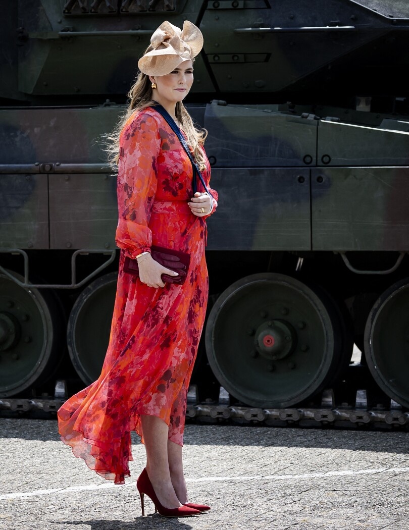 Амалия сломала руку. Не было и речи о том, чтобы бесконечно хандрить во дворце. Ее рука все еще в перевязи от сильного падения с лошади, но будущая королева Нидерландов настояла на том, чтобы почтить своим присутствием вручение нового штандарта гусарскому полку. Отец рядом. На Амалии шляпка от Фабьен Дельвинь, босоножки от G.Rossi и платье от Natan.