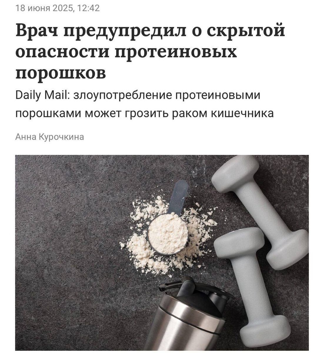 Врачи предупреждают, что белковые порошки могут нанести серьезный вред кишечнику. По их словам, за последние 30 лет заболеваемость раком толстой кишки среди молодежи выросла на 80%. Причину специалисты видят не только в самом протеине, а в добавках — эмульгаторах и ароматизаторах, которые часто входят в состав спортивных смесей. Эти вещества разрушают полезную микрофлору, нарушают работу пищеварения и способствуют образованию токсинов. Медики советуют внимательно относиться к выбору спортивного питания и не злоупотреблять добавками.