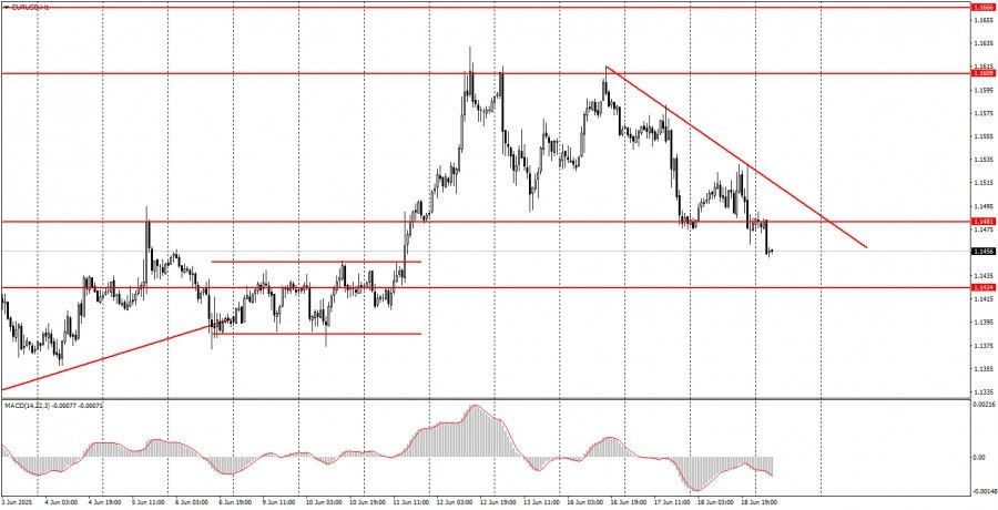 https://basechop.ru/wordpress/?p=46977 Разбор макроэкономических отчетов: Макроэкономических публикаций на четверг не запланировано ни одного. Все, на что сегодня можно будет обратить внимание – это выступления Кристин Лагард и результаты заседания Банка Англии, речь о которых пойдет ниже. Также не следует забывать о военном конфликте между Ираном и Израилем, в который официально могут вступить США, и о торговых перипетиях Дональда Трампа. Именно эти факторы могут оказать влияние на движение обоих инструментов сегодня. Разбор фундаментальных событий: Из фундаментальных событий четверга мы можем отметить выступления Кристин Лагард. Потенциально это важные события, однако мы не ждем от главы ЕЦБ никакой возвышенной риторики. Заседание ЕЦБ состоялось совсем недавно, поэтому никаких новых заявлений мы сегодня не услышим – для этого просто нет никаких оснований. Также отметим заседание Банка Англии, результаты которого известны уже сейчас. Интерес вызывает только результат голосования по