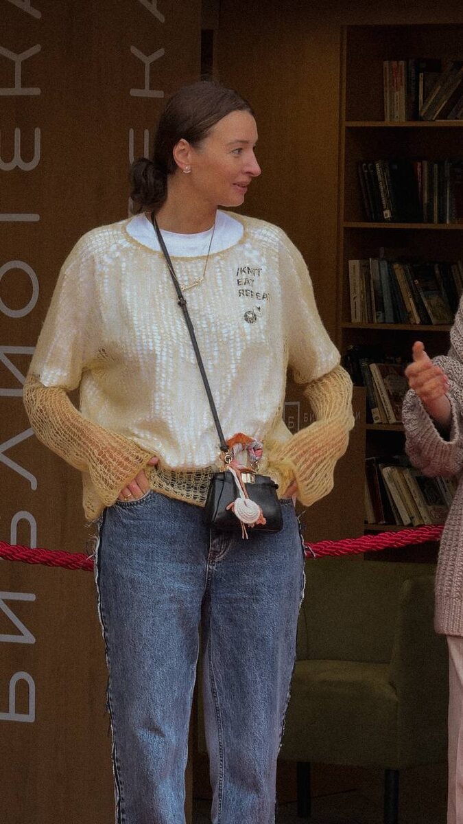 ✨ Паутинки: невесомые свитера, которые словно тёплый воздух окутывают нежностью. Сейчас актуальны образы с футболками, топами, лонгами и даже со спортивными штанами + паутинка На фото стильный образ от Кристины @knit_eat_repeat Связано по нашему видео-МК 😭