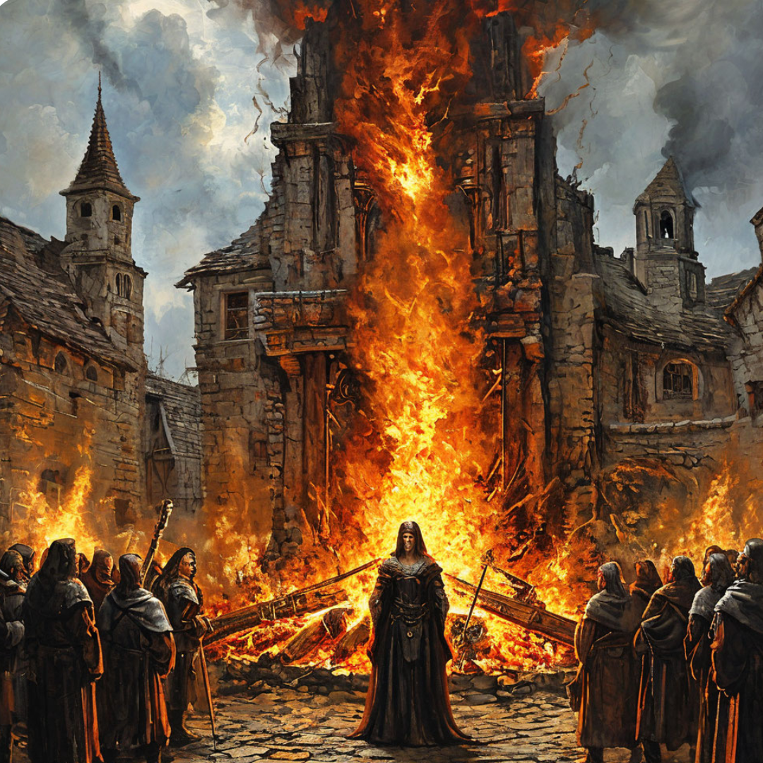 – Нет,— ответил Гадбранд, не подозревая, что речь идет о книге, которую он забыл взять с собой, оставив лежать под досками на полу. Когда же ему стало известно о причинах страдания женщин, которых пытали раскаленным железом, разрыванием суставов, а также отрезанием пальцев, он попытался внести ясность в суть происходящего, но все сочли, что молодой воин, в силу своего возраста, духовного воспитания, а также возможных чувств к девушке, дочери хозяйки, попросту пытается тех оправдать в их грешном деянии. На следующий день за прелюбодеяние и колдовство женщин приговорили к сожжению на костре. Первой сожгли мать, следом вели дочь. Один из рыцарей, наблюдавших со стороны, подошел ближе, сбросил доспехи и, спустив штаны, навалился на несчастную и искалеченную девушку, насилуя сзади, после чего, ухватив ее за волосы, сам поволок на костер. Книгу так же было принято сжечь вместе с ведьмами. Ночью Гадбранд не спал, его терзали кошмары и чувство вины. Рано утром за обгоревшими останками женщин пришли, их решили захоронить, как того требовал христианский обычай, на пересечении двух дорог и без головы.Гадбранд, мучаясь и страдая, нарвал в поле цветов и пришел возложить их на место сожжения невинно убиенных. Положив цветы, он решил присыпать их пеплом, как вдруг заметил ту самую книгу. Она нисколько не пострадала! Осмотревшись и убедившись, что никто не видит, он поднял книгу и спрятал под одеждой.