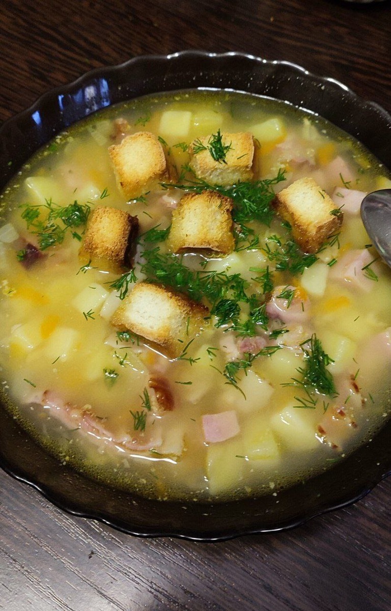 Суп гороховый сборный по-царски. Если хоть раз попробуете, то обычный уже не захотите. Состав: Копчёные рёбра Копчёные окорочек Копчёная колбаска Картофель Горох 1,5 стакана Морковь Лук Зелень и сухари Приготовление: ‼️В самом начале необходимо промыть горох и залить его горячей водой. Не нужно его замачивать на ночь, как советуют бабушки 🫣. Достаточно за час до начала готовки))). #секретныйСекрет Копчёные рёбрышки разрезать, и поставить вариться. В это время колбасу и окорочек нарезаем мелко. Картошку почистить и порезать кубиками. Когда ребра выварятся и мясо легко с них можно будет снять, выбираем их, чтоб остыли. В бульон закладываем картофель и горох. Зажарка для супа стандартная: морковь и лук обжариваем в небольшом количестве растительного масла. Когда горох сварится, в кастрюлю выложить все копчёное мясо, порезанное заранее, зажарка. Добавить соль по вкусу. К гороховому супу подать свежую измельчённую зелень и сухарики. Суп получается, очень наваристым. Делаю его не перв