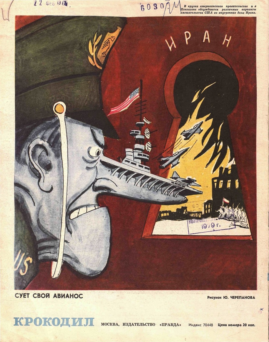 Он засунул нос своему авианосцу Преемственность «вмешательства» США в иранские дела: карикатура Ю.Черепанова в советском сатирическом журнале «Крокодил» №4 за 1979 год иллюстрирует новость: «В американских правительственных кругах и в Пентагоне обсуждаются различные варианты вмешательства США во внутренние дела Ирана».