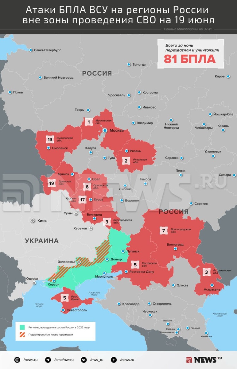 В Брянской области нейтрализовано 19 беспилотников, 17 — в Курской, 13 — в Смоленской, семь — в Волгоградской, шесть — в Орловской, по пять — в Ростовской области и Крыму, по три — в Белгородской и Астраханской, два — в Рязанской и один над Подмосковьем.