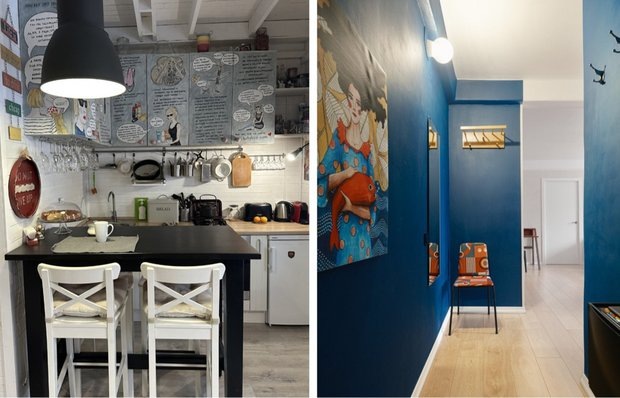 Решения, которые легко повторить и в вашем интерьере Обновление интерьера не всегда требует больших затрат. Иногда достаточно небольших изменений, чтобы преобразить пространство. Делимся реальными примерами, как быстро и бюджетно освежить интерьер вашего дома. Один из самых простых и эффективных способов обновить интерьер — перекраска стен. Выбор свежих, светлых оттенков может визуально увеличить пространство и добавить легкости. Не бойтесь экспериментировать с яркими цветами, ведь они способны значительно преобразить обстановку и создать уникальную атмосферу. В этой прихожей дизайнер Мария Качкина перекрасила стены в насыщенный синий цвет, что сразу же привнесло динамику и свежесть в дизайн. Яркий оттенок визуально расширяет пространство, добавляя глубину и характер. Он прекрасно сочетается с различными элементами декора и способствует созданию уютной и стильной обстановки. Красить можно не только стены, но и фасады мебели, что позволяет быстро обновить интерьер. Блогер Даша Титова пр