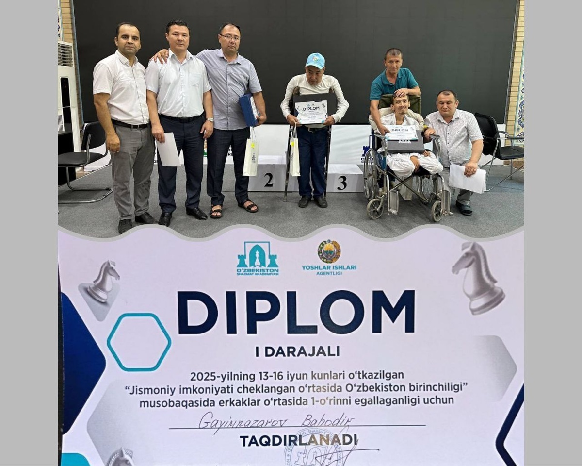 Жиззахлик икки нафар спортчи олтин ва кумуш медални қўлга киритди Ўзбекистон шахмат федерацияси ҳамда Халқаро шахмат академияси ҳамкорлигида 20 ёшгача бўлган жисмоний имконияти чекланган ўғил болалар ва қизлар, эркаклар ва аёллар ўртасида шахмат бўйича Ўзбекистон биринчилиги мусобақаси ўтказилди. Мусобақада Жиззах вилоятидан бир йўла икки нафар спортчимиз Баходир Гайимназаров ва Aнвар Aраловлар Ўзбекистон чемпионати олтин ва кумуш медални қўлга киритиб, IPCA (Халқаро ногиронлар шахмат ассоциацияси)нинг 24-Жаҳон чемпионатига йўлланмани қўлга киритишди. Каналимизга обуна бўлинг ва энг сўнгги янгиликларни кузатиб боринг Jizzaxnews |Тelegram | Facebook | Dzen | YouTubе