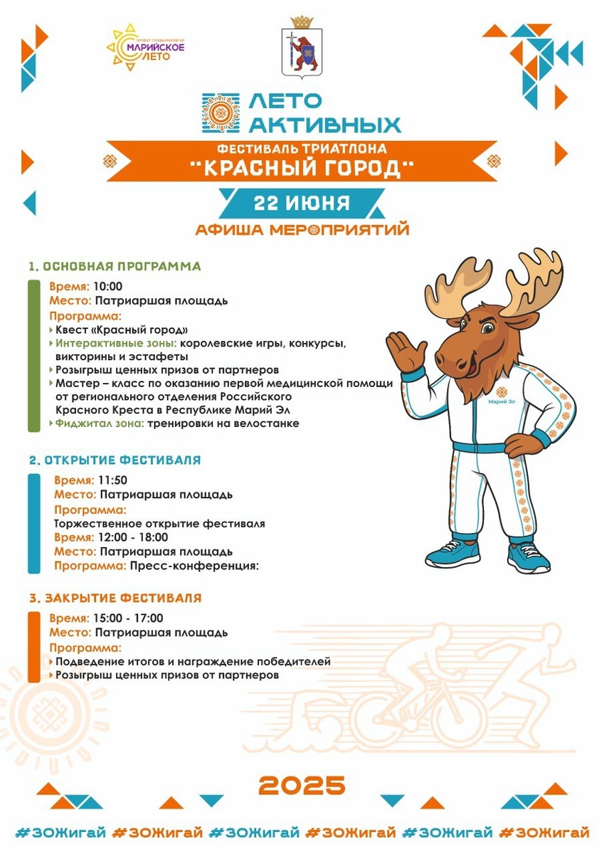 22 июня в Йошкар-Оле пройдет Фестиваль триатлона «Красный город» Фестиваль триатлона начнется в 10:00 на Патриаршей площади. Для участников будут организованы интерактивные зоны с играми, конкурсами и эстафетами, розыгрыш призов, мастер-классы, тренировки на велостанке. В 11:50 начнется торжественное открытие мероприятия, соревнования пройдут с 12:00 до 18:00.