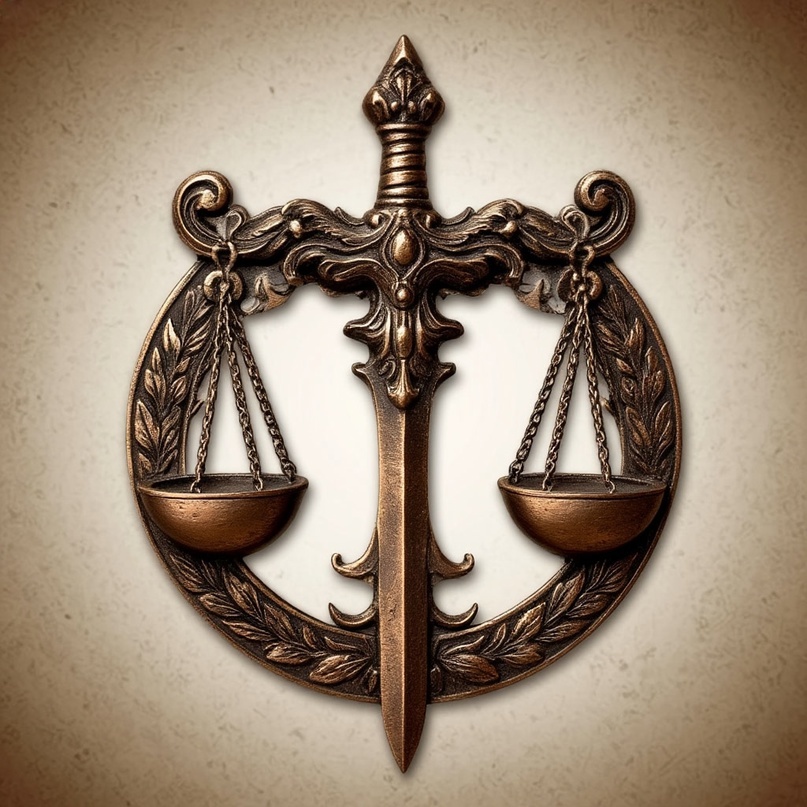 Весы на рукояти меча – древнейший символ равновесия, справедливости и правосудия. Меч символизирует силу, и решимость применить его для защиты закона, весы же – беспристрастный и справедливый суд. Эти два предмета – атрибуты богини Фемиды у греков, она же Юстиция у римлян. Эти дамы всегда изображались с повязкой на глазах, подчёркивая беспристрастность решений. В мире Триглава меч и весы – символ совета Равновесия, правителей Новой империи, объединившей земли магов-странников и вольных мастеров. Зародившись во время войны в опустошённых войсками старых империй пограничных землях, Совет объявил главной своей целью предотвращение новой войны между колдунами и механиками. Для этого были установлены строгие законы контроля развития магии и технологий. Совету Равновесия подчиняются собственные войска, а так-же гвардия, прозванная в народе «серыми» за цвет форменных кафтанов. Все подразделения, подчинённые Совету, носят на себе всё тот же символ меча и весов. Исключением являются только маги